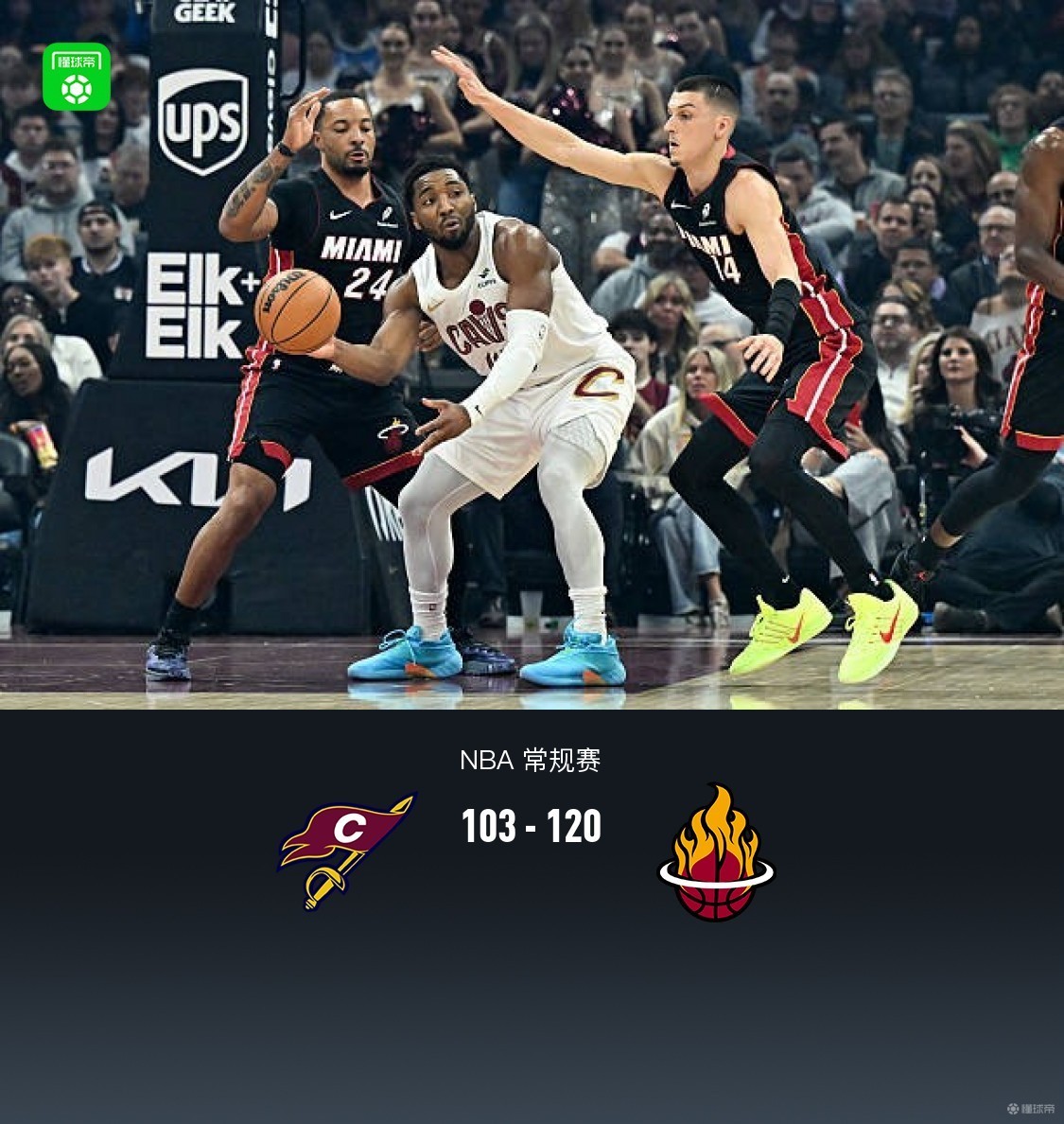 第四節(jié)騎士哈登拿下6分,熱火拉爾森拿下9分,最終騎士103-120不敵熱火
