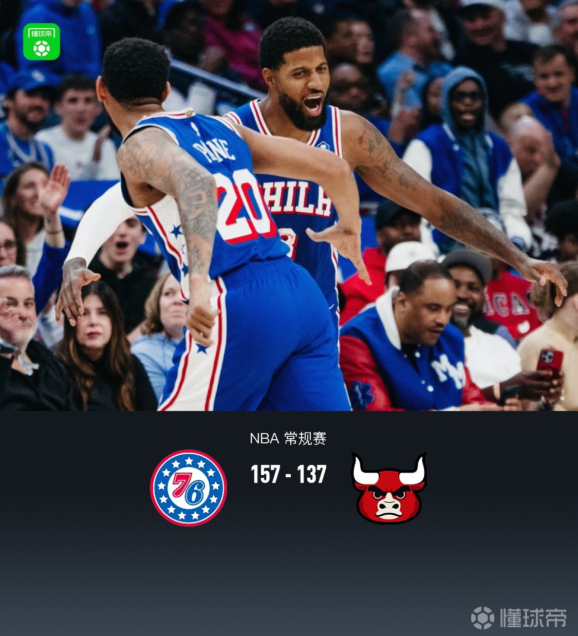 76人157-137大勝公牛,恩比德35+6+7,喬治復(fù)出28分