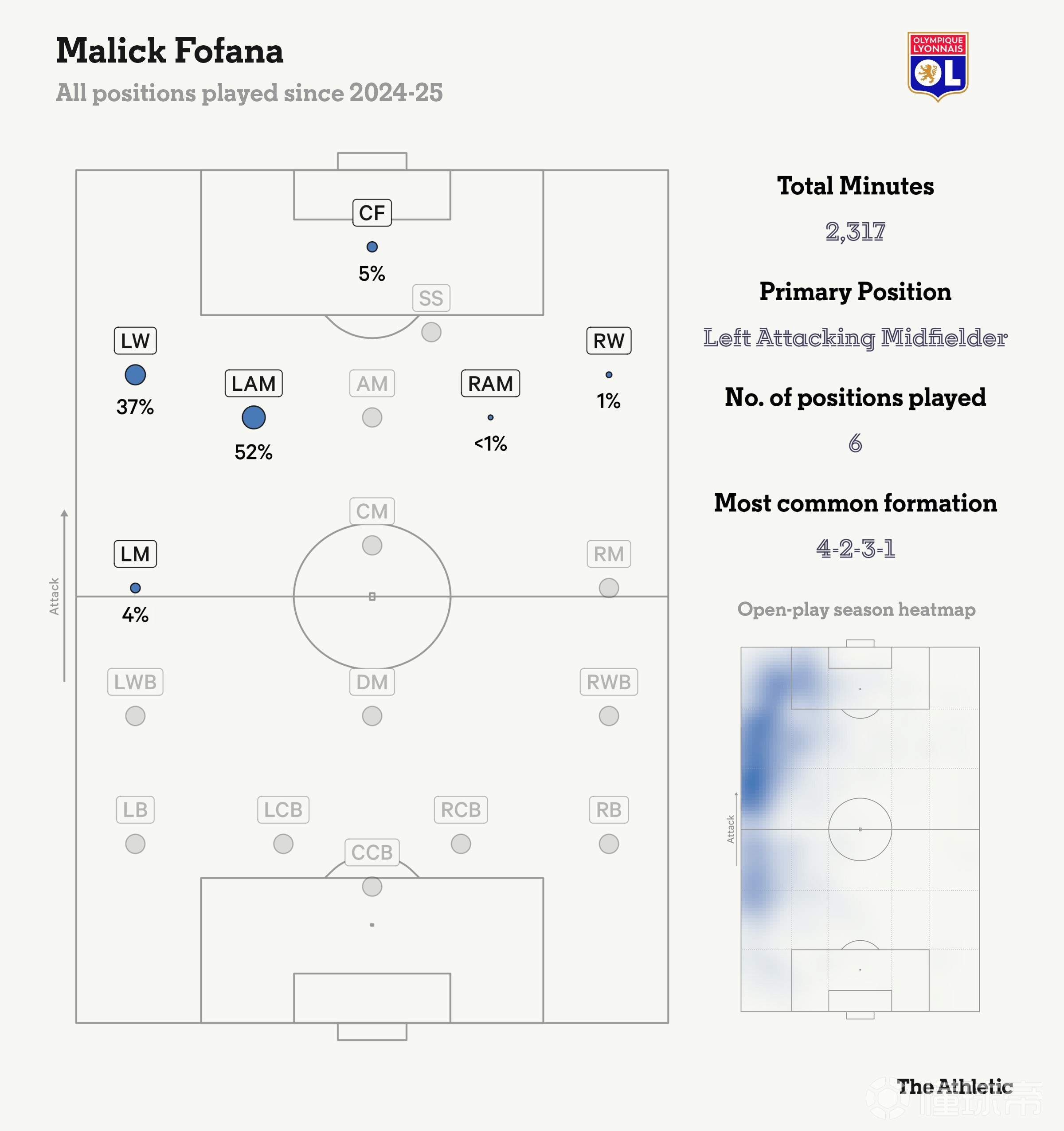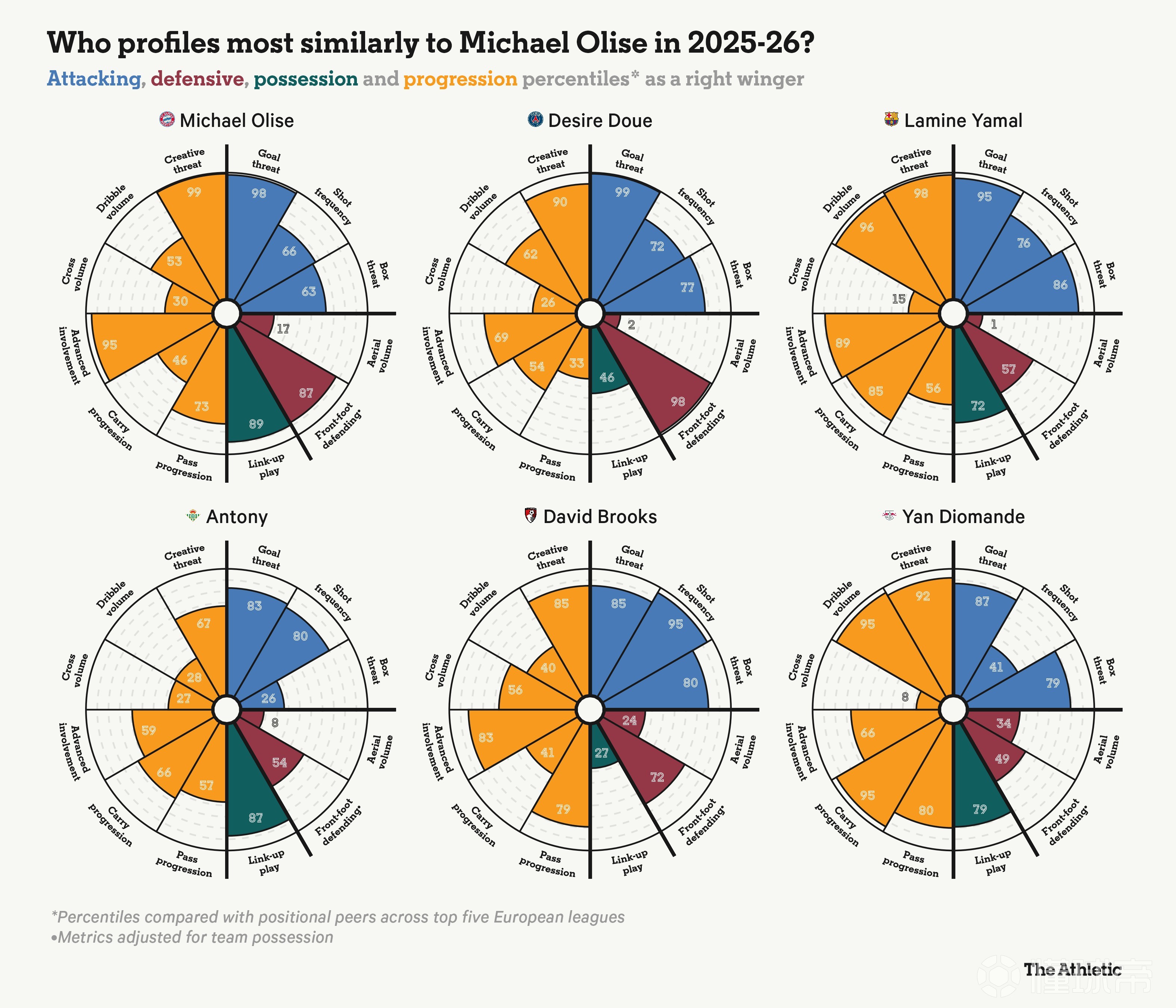 目前很少有左腳右邊鋒能達到更高的水準:在歐洲五大聯(lián)賽中,沒有人能比奧利塞的17次助攻更多。他擁有沉肩變向、在防守球員間穿梭以及在高速奔跑中完成致命一擊的能力,讓他成為足壇稀缺的異類球員。。