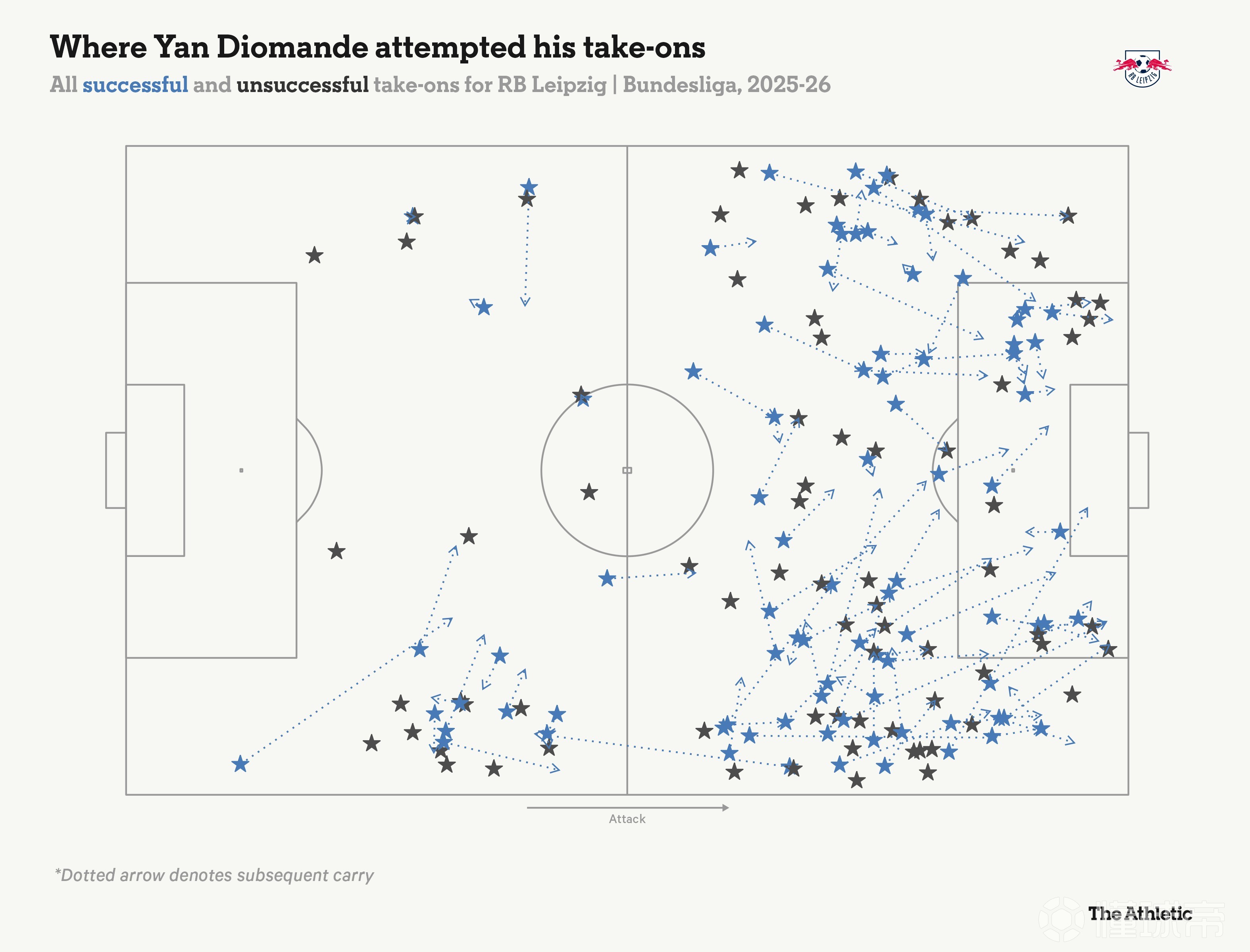 這位科特迪瓦國腳去年夏天才從萊加內(nèi)斯轉(zhuǎn)會至RB萊比錫,但已引起廣泛關注。如上圖所示,迪奧曼德非常喜歡盤帶……非常頻繁。在歐洲頂級聯(lián)賽所有球員中,只有維克托-穆尼奧斯(奧薩蘇納)、維尼修斯(皇家馬德里)和亞馬爾(巴塞羅那)的過人次數(shù)比他更多——如下圖所示,他能在兩條邊路都完成突破。